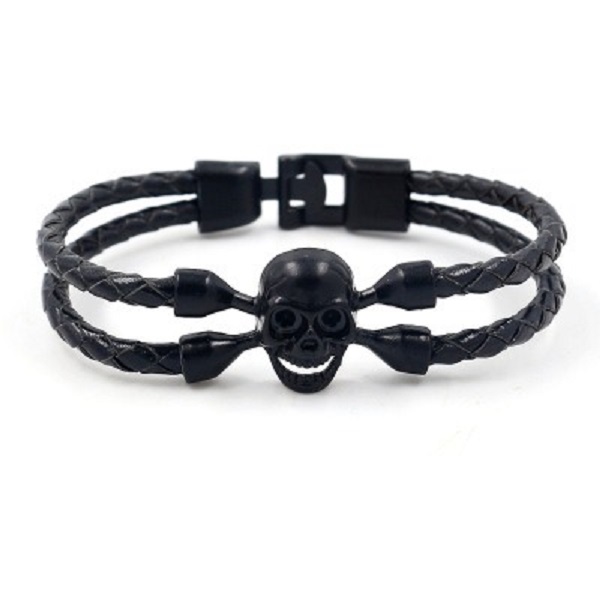 Мъжка гривна SKULL , направена от естествена кожа и елементи от цинкови сплави в черен цвят. Дължина 22см, декорации с ширина 1,5см и 4см.
